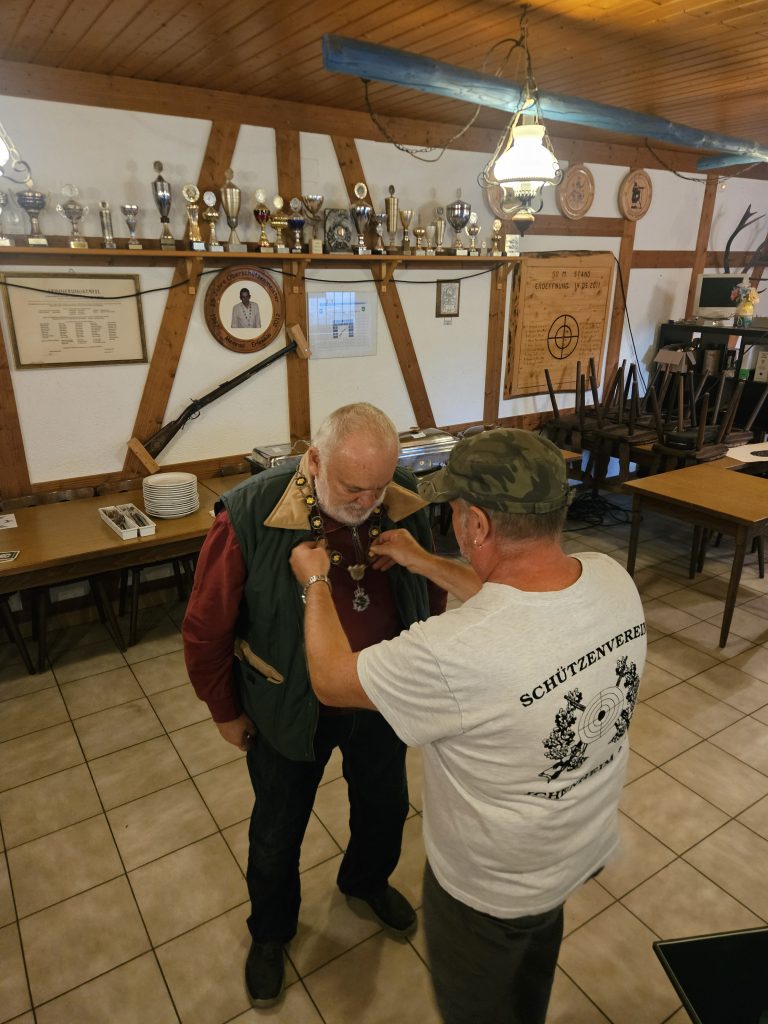 Zur Feier des Tages erfolgte die Proklamation und unser OSM Roland König hatte die Ehre, den erfolgreichen Schützen ihre Anstecknadeln zu überreichen und letztendlich dem neuen Schützenkönig die Königskette umzuhängen. Und das musste selbstverständlich gebührend gefeiert werden. Im Schützenhaus gab es beste Verpflegung (Danke an die Organisatorin Juliane Irslinger).