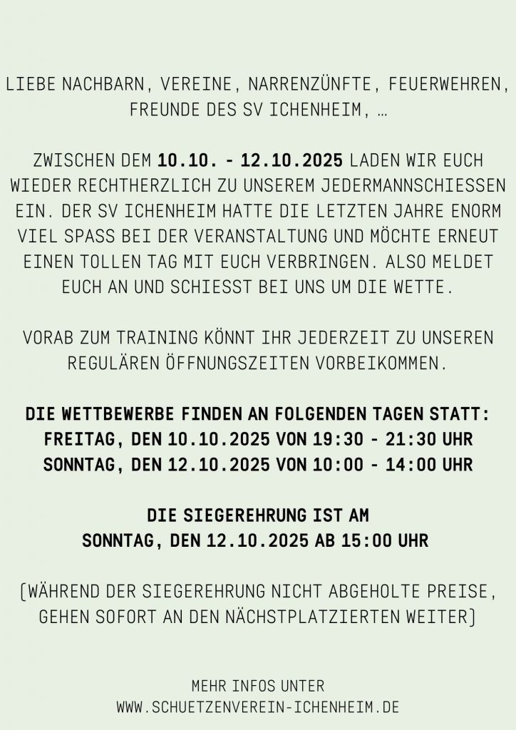 Wir freuen uns auf euren Besuch am 10/12.10.2025 und wünschen „Gut Schuss“